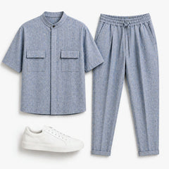 Περιγραφή: Αναβάθμισε το καθημερινό σου στυλ με αυτό το ανδρικό σετ που συνδυάζει άνεση και σύγχρονη αισθητική. Το oversized κοντομάνικο πουκάμισο διαθέτει minimal μαο γιακά και κρυφό κούμπωμα, δημιουργώντας ένα καθαρό και μοντέρνο look. Οι δύο μπροστινές τσέπες με καπάκι προσθέτουν πρακτικότητα και streetwear χαρακτήρα, ενώ η χαλαρή γραμμή εξασφαλίζει άνετη εφαρμογή όλη μέρα.