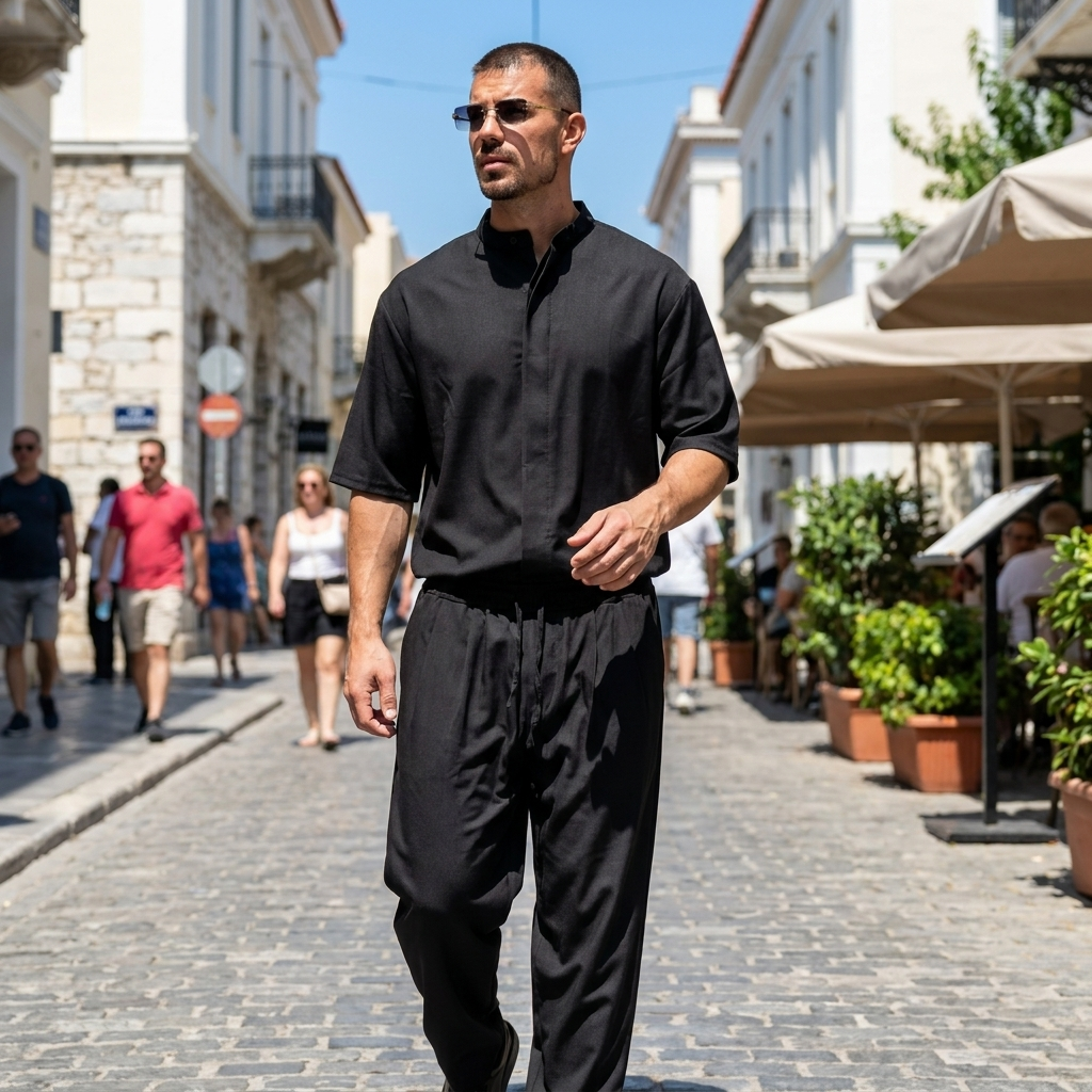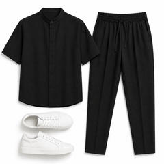 Περιγραφή: Αναβάθμισε το καθημερινό σου στυλ με αυτό το ανδρικό μαύρο σετ που συνδυάζει minimal αισθητική και σύγχρονη άνεση. Το κοντομάνικο πουκάμισο διαθέτει mao γιακά και κρυφή πατιλέτα με κουμπιά, προσφέροντας καθαρές γραμμές και κομψό αποτέλεσμα χωρίς περιττές λεπτομέρειες. Η ίσια γραμμή του εξασφαλίζει άνετη εφαρμογή, ιδανική για all-day εμφανίσεις.