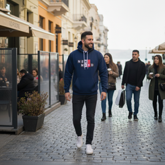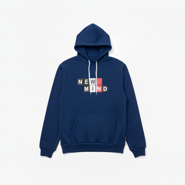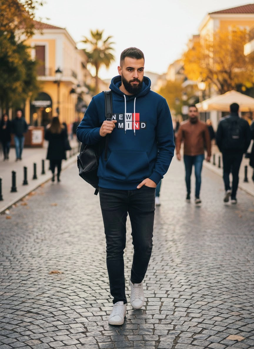 Περιγραφή: Αναβάθμισε το street style σου με το ανδρικό φούτερ NEW MIND από τη Moda Loca. Κατασκευασμένο στην Ελλάδα από 100% βαμβάκι, προσφέρει αυθεντική άνεση και διαπνοή όλη μέρα. Το βαθύ μπλε χρώμα συνδυάζεται άψογα με τη statement στάμπα "NEW MIND" στο στήθος, σε μοντέρνα γεωμετρική σύνθεση με λευκό, μαύρο και κόκκινο φόντο.