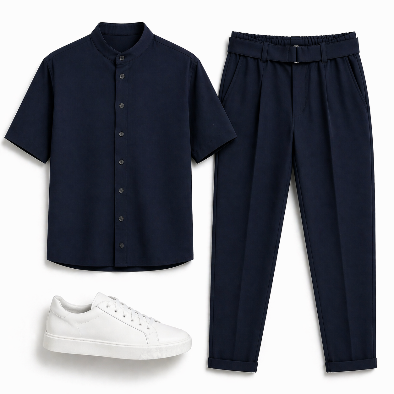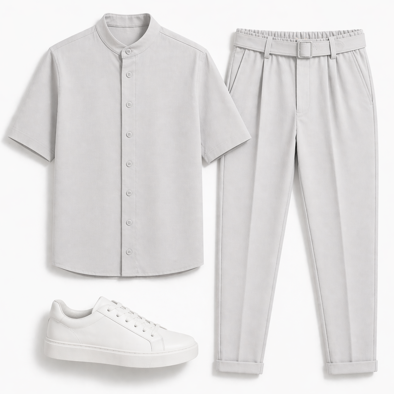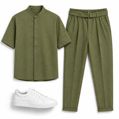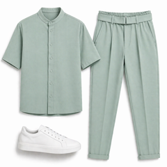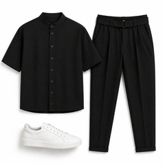 Περιγραφή: Το ανδρικό σετ RECKLESS αποτελεί την ιδανική επιλογή για σύγχρονο και κομψό casual ντύσιμο. Περιλαμβάνει κοντομάνικο πουκάμισο με minimal Mao γιακά και παντελόνι με πιέτα, δημιουργώντας ένα ολοκληρωμένο outfit που ξεχωρίζει για την καθαρή του αισθητική. Η μονόχρωμη σχεδίαση ενισχύει τη διαχρονικότητα του συνόλου, ενώ η προσεγμένη γραμμή προσφέρει ισορροπία ανάμεσα σε άνεση και στυλ.